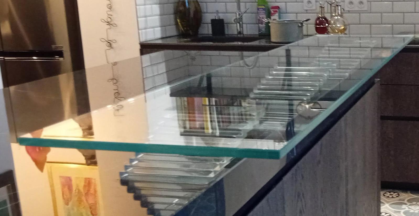 Comptoirs en verre trempé sur mesure. Supports en inox avec platines spéciales collages par u.v Devis gratuit.
